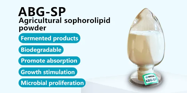 ABG-SP is directly dried by adding a carrier to the fermentation broth of sophorolipid, and the product contains bacterial cells. Products can be used in fertilizers, pesticides and functional agricultural products. It can be used to reduce surface tension, increase spreadability, promote absorption, and enhance efficiency.